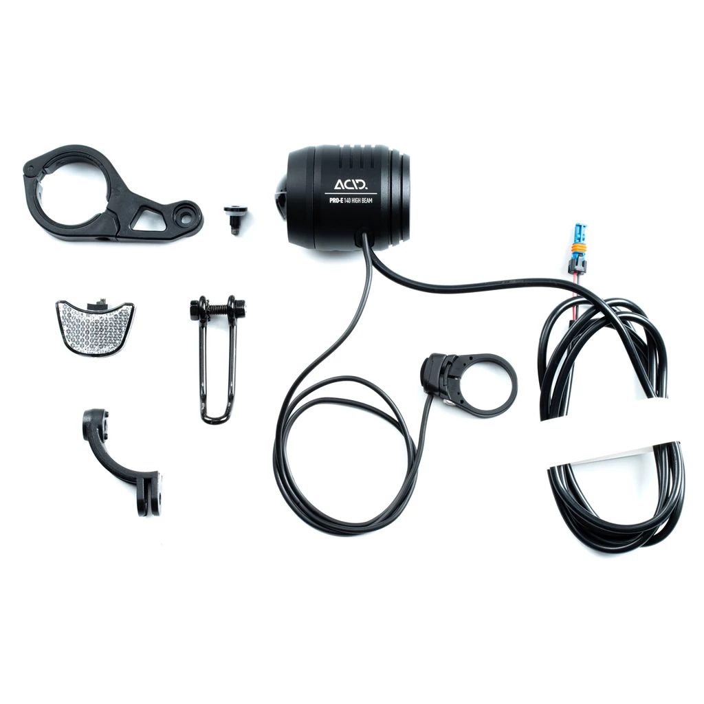 Maximális világítási teljesítmény az e-bike számára – bármilyen terepen! Az ACID E-Bike elülső lámpa PRO-E 140 távolsági fény a legmodernebb MTi technológiás lencsét alkalmazza a hihetetlenül fényes teljes fényt. A kormányra szerelt távirányítóval válthat a normál és a távolsági fényszóró üzemmód között a hatalmas, 140 lux/1100 lumen fényerejű fényerővel. A 130 cm-es kábel és csatlakozó a BOSCH meghajtóegységekhez gyakorlatilag másodpercek alatt illeszkedik e-bike-jához. Tartalmazza a kormánytartó tartót 31,8 mm és 35 mm átmérőjű rudak számára, egy GoPro-kompatibilis univerzális adaptert és egy villatartót a maximális rugalmasság érdekében. Ideje magabiztosan vállalni az éjszakát. Jellemzők |