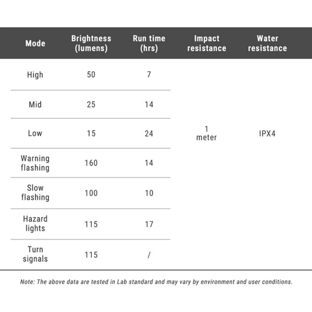 Ravemen NT101 akkumulátoros hátsó lámpa újratervezett „snap-fit” rögzítőklipsz rendszerrel, ami erősebb, stabilabb rögzítést biztosít, ellenállóbb a rázkódással és terephasználattal szemben. Az új NT101 minden funkcióját megtartotta, viszont megbízhatóbb és praktikusabb lett az új, stabilabb rögzítőrendszernek köszönhetően. Az NT101-gyel nemcsak biztonságosabban kerékpározhatsz, de menőbb is leszel. A beépített indexek, féklámpák és a 120 dB-el duda gondoskodik róla, hogy mindenki észrevegyen, a távirányítóval pedig gyerekjáték kezelni az összes funkciót. Csatlakozz a biztonságos bringázás forradalmához! Fényvetítő sávok a talajra: Egyedi fényvetítő sávok vetülnek a talajra, amelyek figyelmeztetik a közeledő járműveket. A kerékpáros számára egy virtuális sávot jelölnek ki, így még jobban láthatóvá válik. Index és hangjelzés: A távirányító egy gombjának megnyomásával könnyedén aktiválhatod az irányjelzőket. A kürt hang egy gombnyomással aktiválható a távirányítóról, de akár ki is kapcsolható. Lopásgátló rezgésérzékelős riasztó: A kerékpárra szerelt szenzorok érzékelik a rezgéseket és ha ezek elérnek egy bizonyos szintet, a riasztó megszólal. Fékezés észlelés: Fékezéskor automatikusan 3 másodpercre bekapcsolja a hátsó lámpát, hogy figyelmeztesse a mögötte haladókat, hatékonyan megelőzve a ráfutásos ütközéseket és a közlekedési baleseteket. Vezeték nélküli kapcsoló: Könnyen és biztonságosan szabályozhatod a lámpát anélkül, hogy elengednéd a fogást. Kétféle módon rögzítheted: - Kerek nyeregcső: A legtöbb hagyományos kerékpárnál található kerek nyeregcsőre (általában 27-35 mm átmérőjű) rögzíthető. Tartozék ABM23 bilincses konzol a nyeregcsőre rögzítéshez. - Csomagtartó: Ha a kerékpáron csomagtartó van, akkor arra is felteheted a ABM22 konzollal. 2200 mAh-s akkumulátorral van felszerelve és USB-C töltőporttal rendelkezik. Az akkumulátor kapacitása viszonylag nagy, ami azt jelenti, hogy hosszú üzemidőt biztosít egyetlen töltéssel. Az USB-C port pedig lehetővé teszi a kényelmes töltést. A lámpa 32 darab nagy fényerejű LED-del rendelkezik, amelyek akár 160 lumen fényerőt is biztosítanak, emellett 6 különböző világítási móddal rendelkezik. Magas fényerő mód: 50 lumen, 7 óra Közepes fényerő mód: 25 lumen, 14 óra Alacsony fényerő mód: 15 lumen, 24 óra Figyelmeztető villogás mód: 160 lumen, 14 óra Lassú villogás mód: 100 lumen, 10 óra Vészvillogó mód: 115 lumen, 17 óra Irányjelző mód: 115 lumen A csomag tartalma: NT101 - kerékpárlámpa USB-C töltőkábel ABM23 - nyeregcsőre szerelhető tartó ABM22 - csomagtartóra szerelhető tartó Használati útmutató Opcionálisan választható kompatibilis kiegészítők: (nem része a csomagolásnak, de kompatibilis a termékkel) ARS04 - vezeték nélküli távirányító Figyelem! Az új rögzítőelemek nem kompatibilisek a korábbi NT101 modellekkel! |