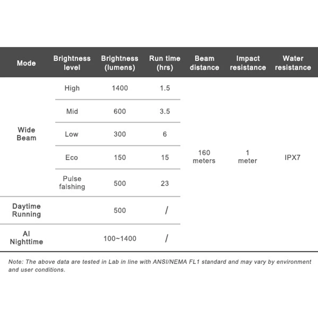 Örömmel jelentjük be, hogy a világ első AI technológiával ellátott kerékpáros lámpája hivatalosan is piacra került! Ez az AI-technológiával rendelkező bringás lámpa tanulmányozza és megjegyzi a felhasználók kerékpározási szokásait, majd automatikusan állítja a fényerőt mind a szokások, mind a környezeti fényviszonyok alapján, így végül maximalizálja a kerékpárfény üzemidejét. AI intelligens éjszakai üzemmód: Bemutatjuk az új tökéletes társatokat esti kalandjaitokhoz! Az egyedülálló AI éjszakai üzemmódnak köszönhetően a kezetek szabad marad, hiszen a fényerő automatikusan állítódik a kerékpározási szokásaitokhoz igazodva, így a teljesítmény maximális kihasználásával aggodalom nélkül tekerhettek. A lámpa emellett powerbank-ként is funkcionál és USB-C kábellel tölthető, sőt! tölthetsz akár más eszközöket is. Bármilyen időjárásnak és kihívásnak ellenáll, illetve bármilyen kormánytartóval kompatibilis. Tapasztaljátok meg a kerékpározás világításának csúcsát! Intelligens nappali üzemmód: A fényerő automatikusan változik a környezeti fényviszonyoknak megfelelően. Biztonságosabb kerékpározás: Az egyenletes fényszórásnak köszönhetően a fény minden irányban egyenletesen oszlik el, így jobb oldalsó láthatóságot biztosít. USB-C tölthető: A lámpa gyorsan tölthető USB-C kábellel. A teljes töltés mindössze 1,5 órát vesz igénybe és töltés közben is világít. Fordított lámpatartóval is használható (a csomag tartalmazza) : K405-es fordított adapterrel is kompatibilis, így több hely marad a kormányon. A tartó segítségével így akár GoPro-val együtt is használhatod lámpádat. Strapabíró és vízálló: A repülőgép-minőségű alumínium háznak köszönhetően a fényszóró rendkívül strapabíró és IPX7 (vízállósági) védelemmel ellátott, így bármilyen időjárás esetén és terepen használható. Akkumulátor töltöttségi szint jelző: Egy gomb segítségével egyszerűen ellenőrizhető az akkumulátor töltöttségi szintje. Vezeték nélküli távirányítóval kapható, amely segítségével a markolat elengedése nélkül válthatsz az üzemmódok között. LED: 1" nagy teljesítményű fehér LED Akku: 4000 mAh/3,6V újratölthető lítium-ion akkumulátor Méretek: 106,5 mm (hossz) x 34 mm (szélesség) x 37 mm (magasság) Tartozék ABM03 szilikonos lámpatartó konzol. Tömeg: 177 g Anyagok: A fő test alumíniumból, katonai minőségű III. típusú kemény eloxálással készült. A hátsó rész és a kormányrögzítő konzol tartós műanyagból készült. Megjegyzés: A tervezés és a specifikációk előzetes értesítés nélkül változhatnak. Széles fényszórás Magas: 1400 lumen, 1.5 óra Közepes: 600 lumen, 3.5 óra Alacsony: 300 lumen, 6 óra Eco: 150 lumen, 15 óra Pulzáló villogás: 500 lumen, 23 óra Nappali menetfény: 500 lumen AI esti mód: 100-1400 lumen A csomag tartalma: ABM03 - szilikonos lámpatartó konzol 22,2-35mm kör-profilú és egyes aero-kormányokhoz AUB01 - upside-down mount, GoPro tartókonzolhoz ARS03 - vezeték nélküli távirányító USB-C töltőkábel Használati útmutató és garancia kártya Opcionálisan választható kompatibilis kiegészítők: (nem része a csomagolásnak, de kompatibilis a termékkel) ARB02 - vezetékes távvezérlő ABM01 - (TP) rögzítő bilincs 22,2-31,8mm ABM05 - fix (TP) rögzítő bilincs 31,8-35mm AUB01 - tartósín GoPro konzolra AHM01 - tartókonzol sisakra. (AUB01 konzollal együtt) |
