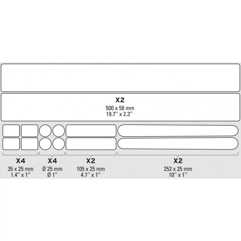 1 db alsó csővédelem ( 500 x 58 mm ), 1 db felső cső védelem ( 500 x 58 mm ), 2 db láncvilla védelem ( 252 x 25 mm ), 2 db hajtókar védelem ( 105 x 25 mm ), 4 db folt ( 35 x 25 mm ), 4 db folt ( Ø 25 mm )
